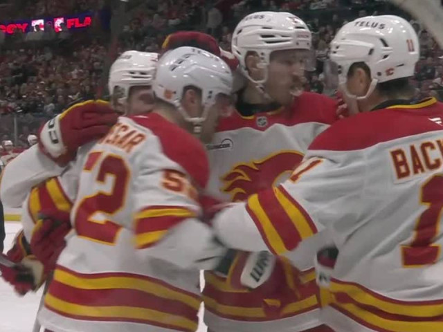 Watch as Calgary Flames defenceman MacKenzie Weegar gets on the board with his first of the season against his former team, the Florida Panthers, to tie the game midway through the first period.