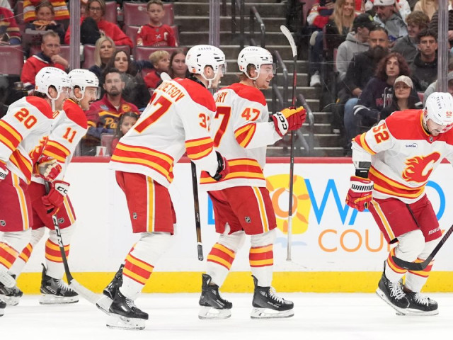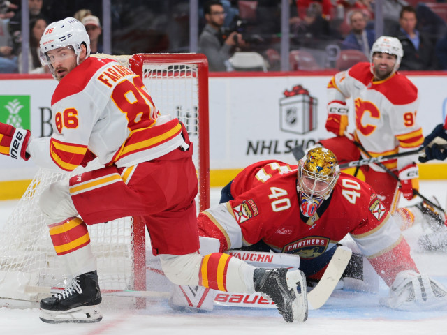 Calgary Flames defenceman Yan Kuznetsov fires home his first career NHL goal with a long wrister by Florida Panthers netminder Daniil Tarasov early in the first period.