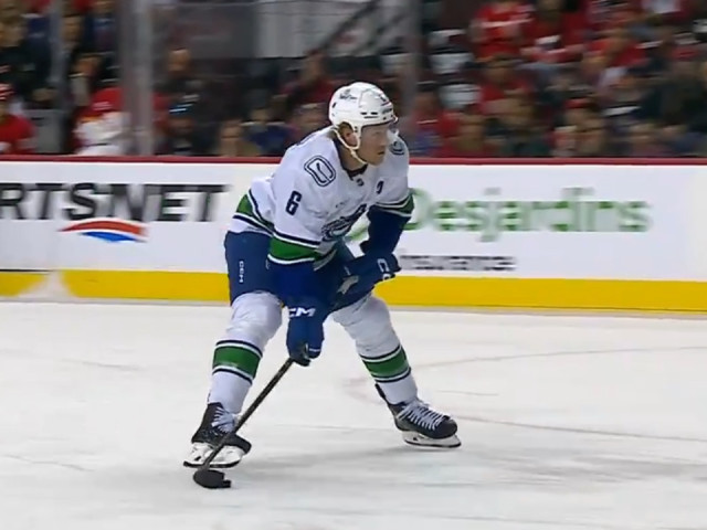 Vancouver Canucks forward Brock Boeser buries a breakaway goal after he is sprung by defenceman Quinn Hughes for an early lead in pre-season action against the Calgary Flames.