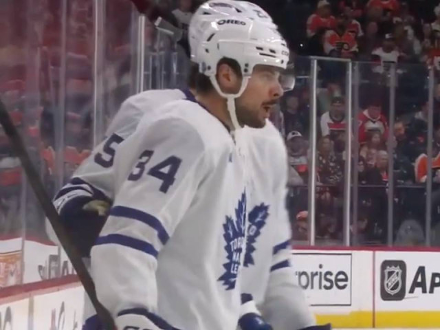 Watch as Toronto Maple Leafs forward Auston Matthews catches a pass from Morgan Rielly and beats Philadelphia Flyers goaltender Dan Vladar with a well-placed shot from distance, marking the 300th even-strength goal of his career.