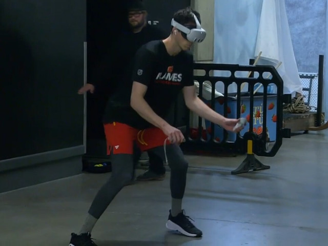 Watch as Calgary Flames goaltender Devin Cooley uses a virtual-reality headset and program to simulate different scenarios to get ready for a game in the crease.