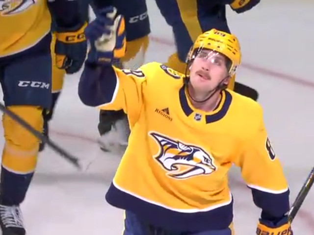 Watch as Nashville Predators forward Ozzy Wiesblatt scores his first career goal in his team’s matchup against the Calgary Flames before pointing upward and paying tribute to his late brother Orca.